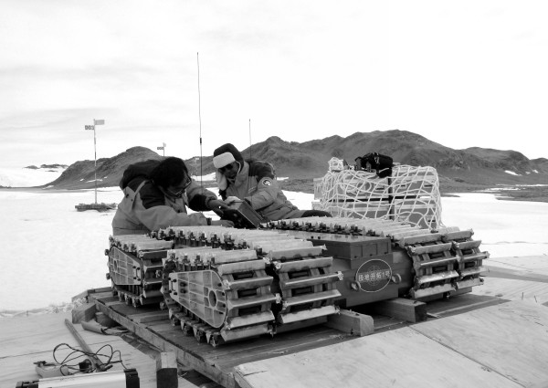 在中国第24次南极科学考察活动期间,我国科考队员成功开展了科考机器人的现场实验,这项研究在我国20多年的南极考察活动中尚属首次。训练机器人作为人类的“替身”进行辅助科学探测活动,是许多国家目前竞相研究的一个课题。图为科考队员在进行冰雪面移动机器人的现场实验准备工作。 (新华社发)