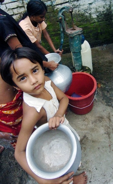 图三:一名孟加拉小女孩在街边的一处水泵旁等待接水
