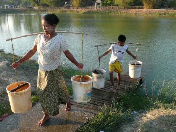 图一:在缅甸仰光附近的一座村庄,两名村民挑水回家。