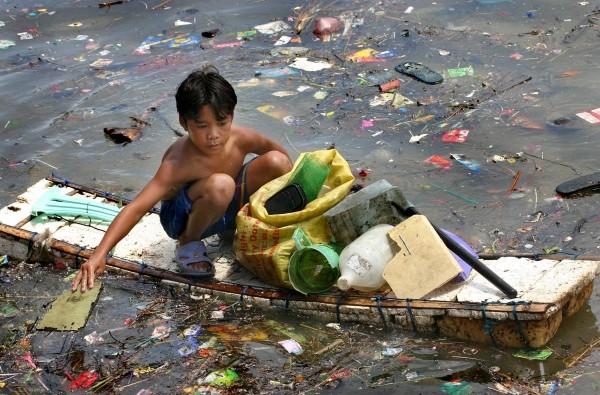 图二:在菲律宾马尼拉的帕西河上,一名男孩蹲在筏子上捡拾垃圾