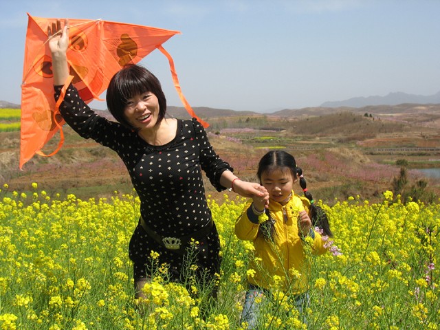 与盛开的桃花相呼应的是油菜花,一对母女赏够了桃花,又在油菜地旁放风筝(图譺〇)。