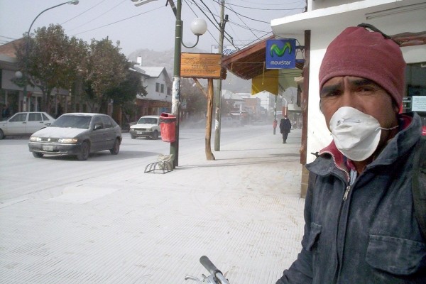 5月2日,阿根廷丘布特省埃斯克尔市的一名居民戴着口罩出行。位于智利南部的柴滕火山当天凌晨喷发,由此产生的火山灰殃及邻国阿根廷,造成埃斯克尔市等多个阿根廷城镇处于火山灰的笼罩下。 (新华社发)