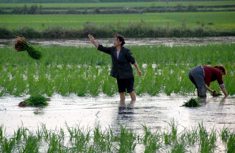 图一:6月1日,汉中市勉县新街子村的农民在稻田里插秧。