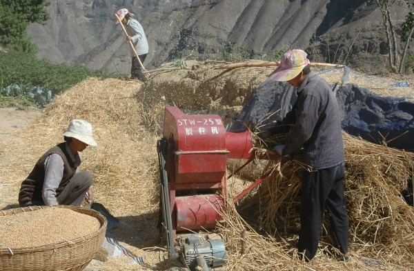 图二:6月2日,陇南地震灾区武都区外纳乡桃树坪村的村民正在对收割回的小麦进行脱粒。