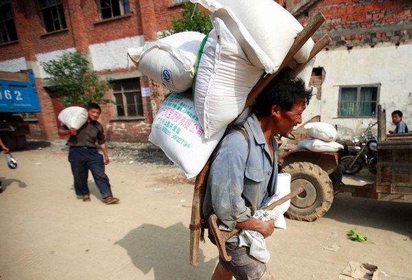 图三:6月1日,在四川广元市白朝乡白朝村,受灾群众正在搬运救济粮。 (新华社发)