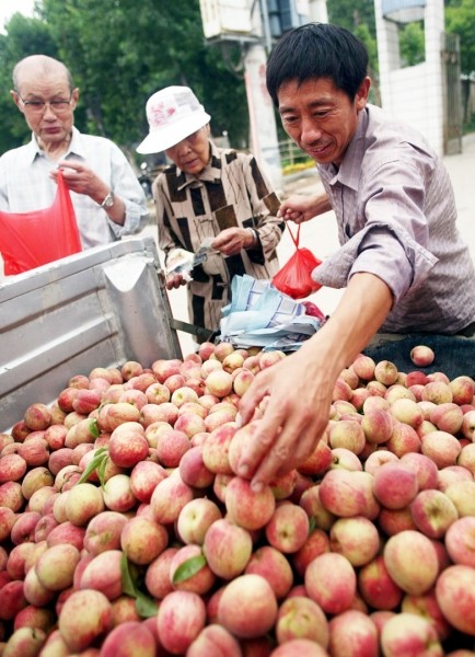 6月15日,曾都区万店镇九里岗农民正向市民推销胭脂红水果桃。村民们说,他们在种好农作物的同时,根据自己的实际情况发展种植养殖业,收入还很可观。