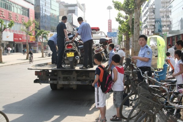 近段时间,市交警支队对城区违章停放的摩托车进行了清理。图为清理现场。 (徐军国摄)