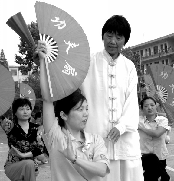 唱歌跳舞练“功夫”,这些健康向上的群众性娱乐健身活动,在我市城乡蓬勃开展,既丰富了群众生活,又增强了体质陶冶了情操。图为曾都区唐县镇退休教师魏明秀,在健身娱乐活动中进行义务教学。(本报记者张顺通讯员章双庆摄)