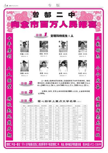 十年磨剑人人面壁腾蛟起凤楚天翘 三载砺志个个发奋泼墨挥毫龙门跃 喜报1 文理科特优生8人 喜报2 上一类线人数再创历史新高,且遥遥领先于全市同类学校。我校理科状元、应届生何