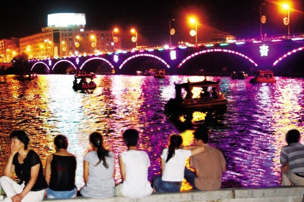 华灯溢彩,霓虹闪烁,6月30日晚,市民们在白云湖夜色美景中尽享休闲之乐。