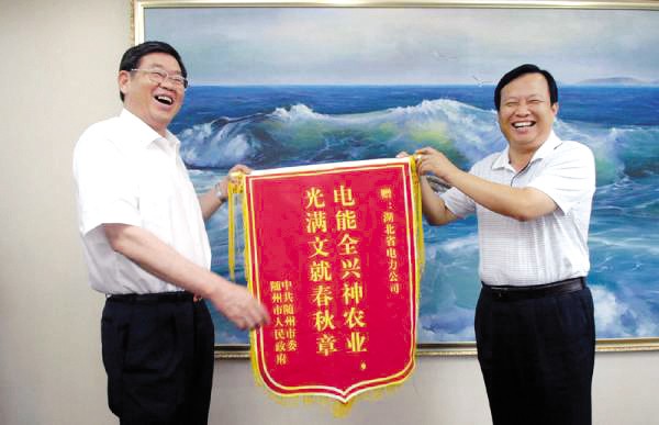 图为市委书记马清明(右)向汤文全赠送锦旗,以感谢省电力公司对我市经济社会发展的支持。(通讯员祁崎摄)