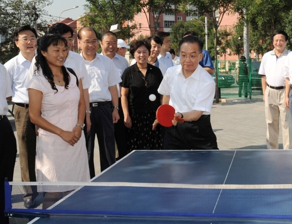 温家宝在丰台区大井社区和群众打乒乓球