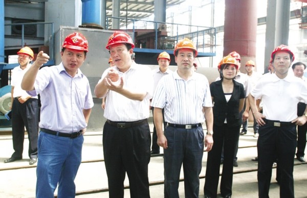 市委书记马清明(右四)、代市长刘晓鸣(右一)率领的我市党政代表团,在黄冈市委书记刘善桥(右三)陪同下,正在企业考察。