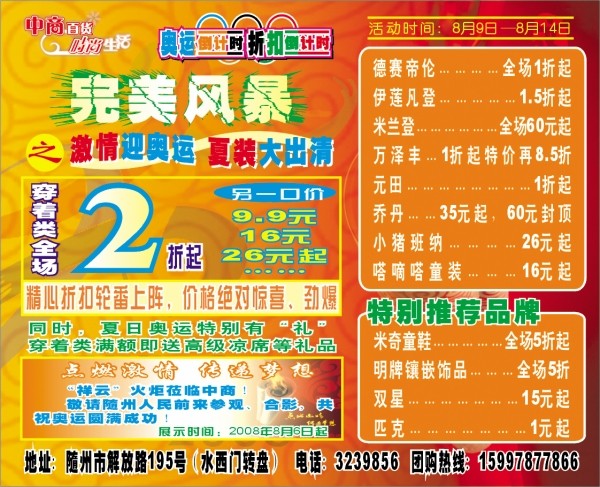 8月8日—24日每晚7-9时,门前电子彩屏为您全程转播CCTV奥运频道,纳凉观赛,为奥运喝彩;奥运会开幕当日,购1-5楼商品不论金额大小,均送奥运小旗(送完为止)。