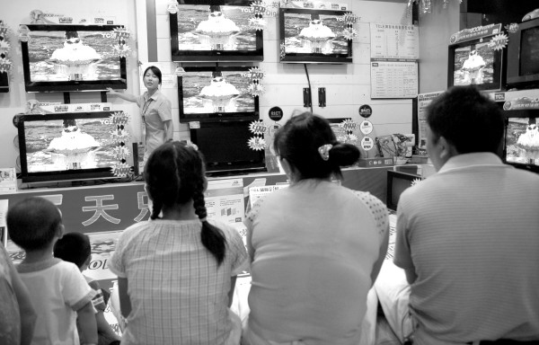 为看北京奥运会,八月七日,家住曾都区北郊的刘先生一家四口,在市广电公司花七千元选购了一台较大的液晶彩电。(本报记者李文军摄)