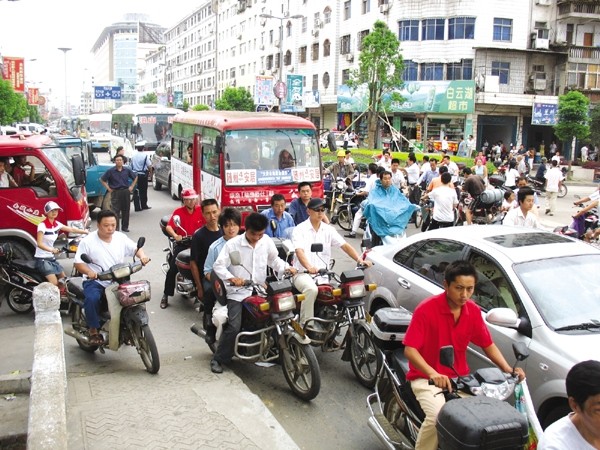 本报讯 见习记者徐王俊、通讯员宫博报道:9月2日上午,城区 水一桥上摩托车、小汽车、公交车堵成一团,鸣笛声响成一片,车水马龙。执勤交警忙碌着直喊“停”。