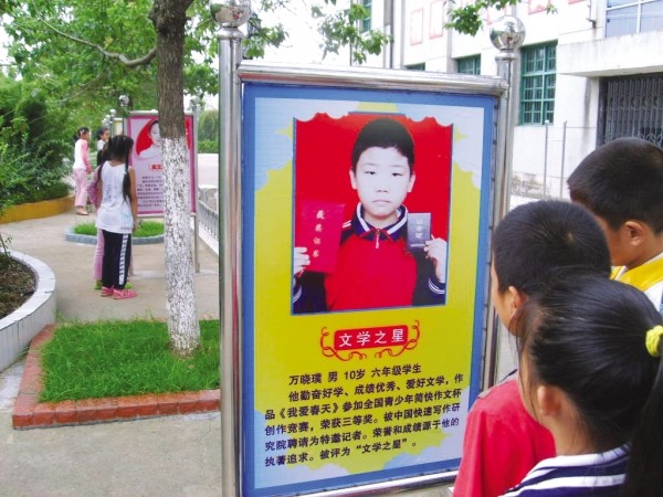 、礼仪之星等九名学生,将他们的照片放大后制成宣传牌,形成一条“星光大道”,成为学生们学习的榜样。图为九月三日,该小学生观看“文学之星”