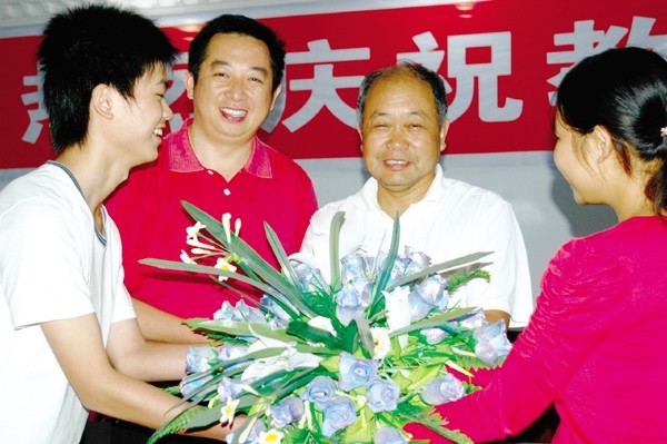 9月10日上午,曾都区职业高中退休教师肖开江(右二),接受该校师生送给他的鲜花和节日祝福。