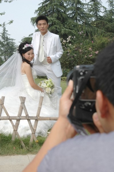 中秋佳节,许多新郎新娘选择这天拍摄婚纱照,以表达自己对未来生活美好憧憬。图为随城余夫人婚纱影楼摄影师在为一对新人拍婚纱照。 (本报记者 陈德友摄)