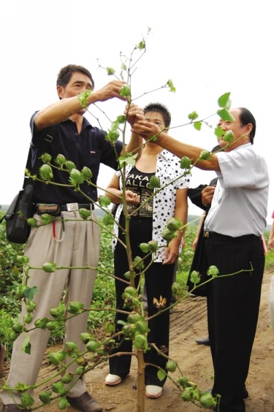 9月20日,来自湖南农科院的棉花专家钱本校(右一)在参观市经济开发区淅河镇沙畈村无土育苗华丰一号棉花后,拔出一株长有100余个棉桃的棉花,现场制作标本准备带回湖南。 (本报记者 李文军摄)