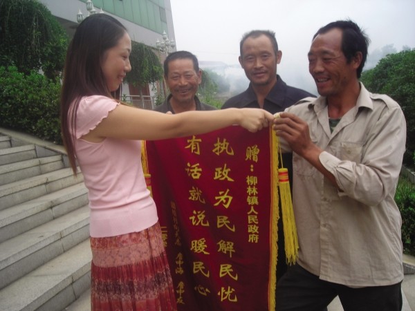 曾都区柳林镇团结村向天志等三农户的三头耕牛在河中被电击死。他们来到镇“有话就说”接待厅反映情况后,镇委、政府迅速组织专班调查处理,及时协调供电、电信部门赔付经济损失16000余元。图为农户向政府赠送锦旗。 (程立键 摄)
