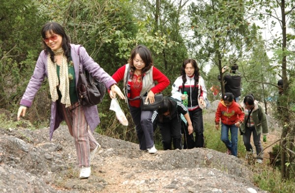 右下:9月29日至30日,近百名市民自发组织大洪山地质公园2日游。大家白天游览火山遗址,晚上参加篝火晚会,玩得十分开心。图为游客在火山口一带游览火山遗址。 (本报记者 李文军摄)