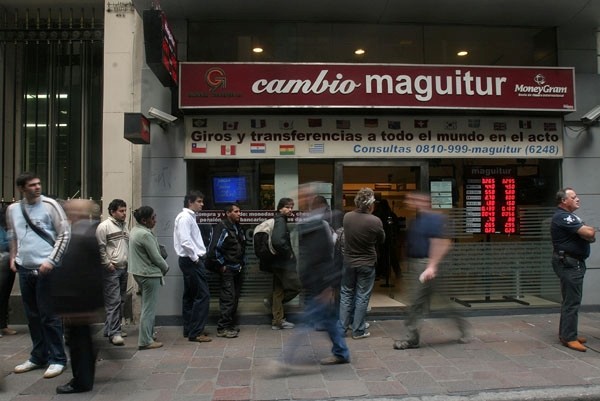 10月10日,在阿根廷首都布宜诺斯艾利斯,市民们在一家货币兑换所前排队准备兑换美元。阿根廷金融市场近期出现剧烈动荡,许多民众都选择购买美元来规避本国货币比索贬值的风险。美元兑换阿根廷比索的比价也节节上扬,当天升至1比3.29,达到几个月来最高点。 (新华社发)