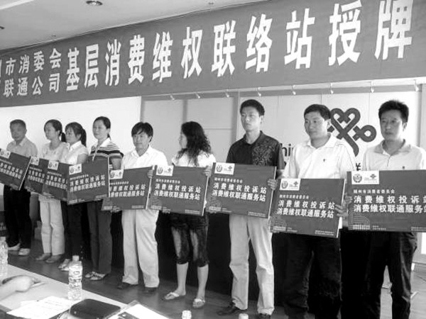 2007年3·15期间,中国联通随州分公司与随州市消费者委员会联合设立了全市首个 “消费维权联络站”,并建立了与当地消费者组织快速、高效的联动的机制,及时有效地解决了消费者的各类问题,切实地维护了消费者的利益,受到了各级消费者权益保护单位与用户的高度评价。2008年,为进一步提高全市消费维权的能力和水平,有效改善基层消费维权的便捷性,使消费维权工作更好地服务于新农村建设,中国联通随州分公司又将36家重点乡镇达标合作营业厅建设成为 “消费维权联络站”,并与随州市工商局12315指挥中心合 作 , 在 全 省 率 先 开 通 了10655806315短信投诉平台,为广大消费者提供了更多、更快捷、更方便的投诉渠道。