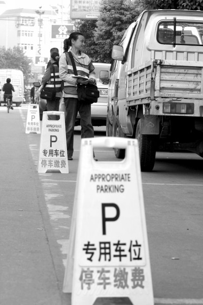 继随州城区解放路实行规范停车以来,城市停车秩序大为改观,昨日,市交警大队、市城管执法局东城分局联合行动,对舜井大道等城区多条街道核定专用车位,其专用车位每车收费2元。 (本报记者 杨闻名摄)