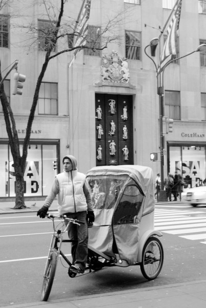 ◆美国3亿人口,3亿多部车辆,人称“车轮上的国家”。汽车之国也有用得上三轮的时候,这是纽约曼哈顿第五大道上翘首待客的三轮。