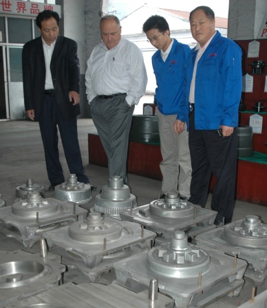 10月21日,美国一家著名汽车公司全球采购总经理威特先生,专程来到湖北全力公司进行考察和参观,并签订新年合作和产品销售合同。图为威特先生(左二),在该公司董事长、总经理聂孝全(右一)的陪同下,参观了解企业产品和生产情况。 (本报记者 陈德友摄)