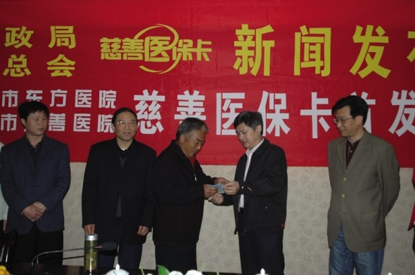 十月二十九日上午,市民政局、市卫生局、市慈善总会暨市东方医院在随州宾馆举行慈善医保卡首发仪式。图为厉山镇白岗村农民何儒桥(右三)获得首张医保卡。(本报记者陈德友摄)