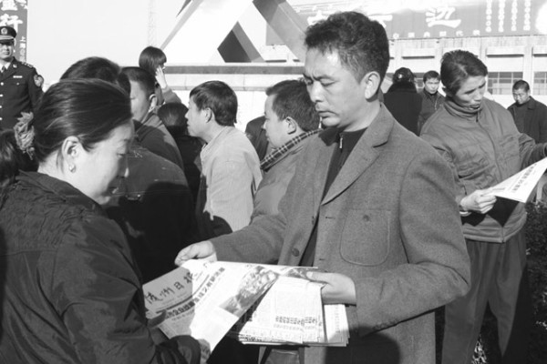 市交通运政人员正在向出租车司机和群众发放当日随州日报,宣传出租车管理有关政策。 (徐军国 摄)