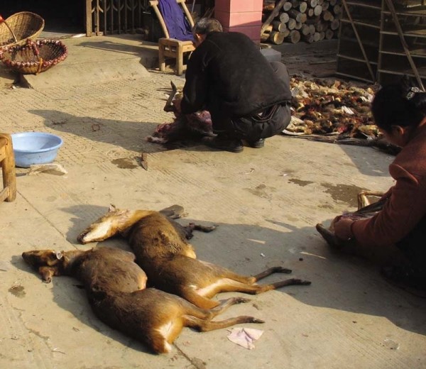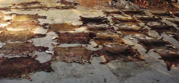 日前,记者在曾都区环潭镇某村看到,野生动物被摆上了市场,图中两只野羊正准备剥皮(1图)。野羊、野猪属国家二级保护动物,年关将至,我市部分山区农民又开始偷捕、偷卖野生动物。