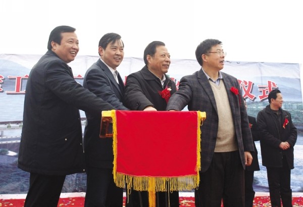 1月4日上午,省人大副主任刘友凡(左三)、省水利厅厅长王忠法(左二)、市委书记马清明(左一)、省联合发展投资公司总经理李红云(左四)共同启动按钮,宣告白云湖水库工程正式下闸蓄水。 (本报记者 孙洪涛摄)