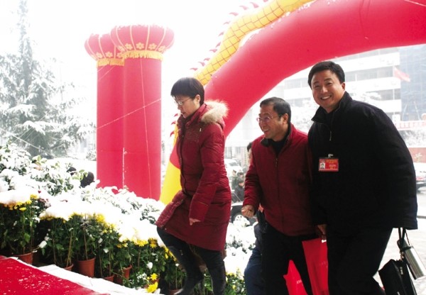 昨日上午,参加市二届人大四次会议的市人大代表踏着积雪,满怀激情步入会场。(本报记者孙洪涛摄)