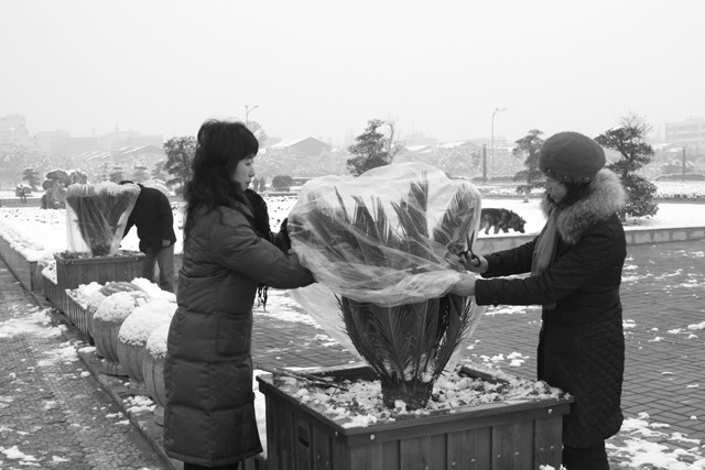 连日来,随州市园林部门工作人员积极行动,给树木穿上“冬衣”,确保树木安全过冬。 (徐军国摄)