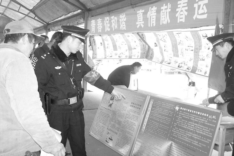 近日,我市铁路警方组织青年民警和春运志愿者,开展了以“青春促和谐,真情献春运”为主题的爱民实践活动。铁路警方向旅客讲解安全常识、宣传防扒防骗知识,将真情和温暖送给旅客。(林永俊钟璇摄)