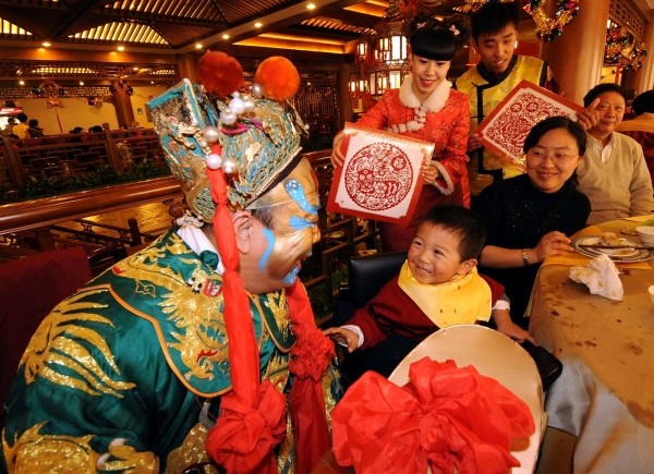 在北京前门全聚德烤鸭店,工作人员扮演的“财神”和“金童”“玉女”向顾客贺新春。