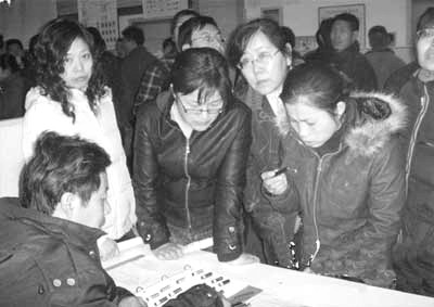 春节刚过,山东威海市40多家企业就来到市职业介绍中心进行招聘,以缓解企业缺工问题。图为一家企业的招聘人员正与几名求职者洽谈。 (新华社发)