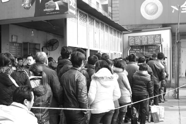 小汪回家后,把所见所闻向自己父母一说,他们一家人一合计,决定当晚去排队。22日晚8时许,小汪到四方大成处的代售点等候,他父母则在水西门处的代售点排队等候。冬日的气温降至0度以下,他们虽然穿着棉大衣,但感觉还是冷。漫长的冬夜一分一秒地过去,早上8点,代售点开始售票。小汪总算等“抢”到了两张站票。他连忙打电话把喜讯告诉父母,父母闻讯后,舒了一口气,高兴地从等待买票的队伍中走了出来。虽然他们也有抱怨,再看看后面排的长队,他们已经感到很满足了。