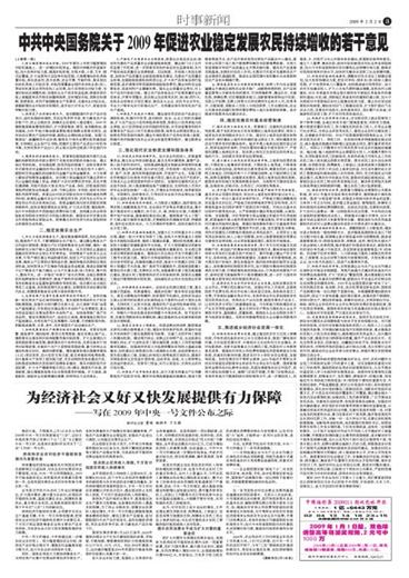(上接第一版) 2、较大幅度增加农业补贴。2009年要在上年较大幅度增加补贴的基础上,进一步增加补贴资金。增加对种粮农民直接补贴。加大良种补贴力度,提高补贴标准,实现水稻、小麦、玉