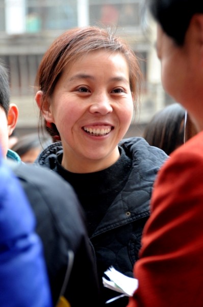 图为一位返乡农民工找到了适合自己的岗位,露出了笑容。本报记者 李文军摄影报道