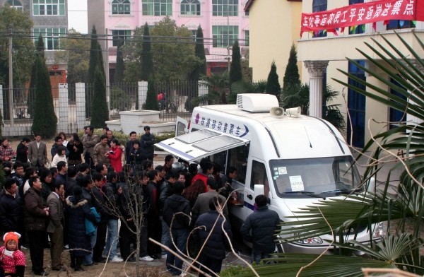 2月1日,在湖北省天门市横林镇,农民工在移动售票车前购买火车票。据天门市劳动和社会保障局工作人员介绍,该市约有11万农民工在节后返岗。为缓解农民工购票难,武汉铁路局从2月1日至3日组织工作人员深入天门市各乡镇为农民工送票。 (新华社发)