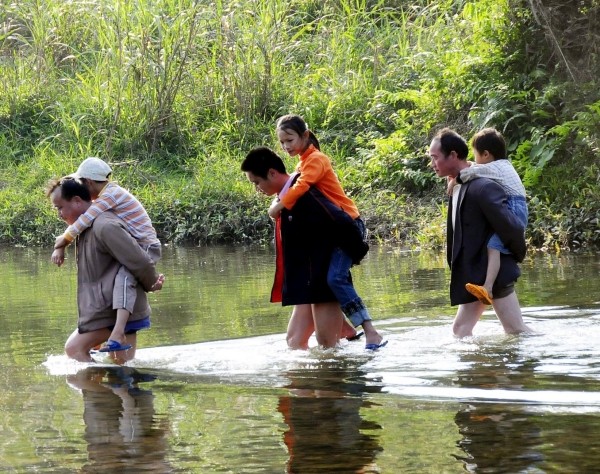 在海南省琼中黎族苗族自治县湾岭镇的黎母山下,一条大河蜿蜒流淌,几十年来,两位山村教师用自己的脊背为孩子撑起了一座求学之桥。图为教师王升超(左一)和家长背着学生过河,将学生送回家。 (新华社发)