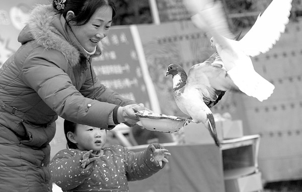 正月初七,随州城区白云公园游人与飞鸽“亲密接触”。春节期间天气晴朗,气温回升,公园每天接待游人数千人次,游客量达到近年来高峰。 (本报记者 杨闻名摄)