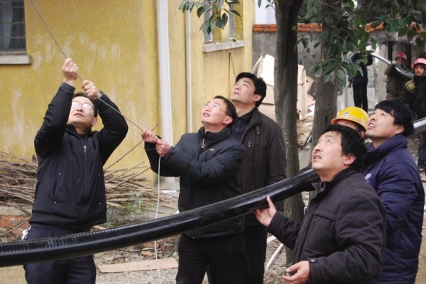 为解决边远农村群众看电视难的问题,新年伊始,我市地面无线数字电视工程已全面启动。该工程由市广电局、随州广电网络分公司、曾都广电网络支公司共同投资500万元,完成主发射塔的前端平台建设,预计2月中旬开通试播。图为工程技术人员在独崇山发射台架设主杆光缆线路。