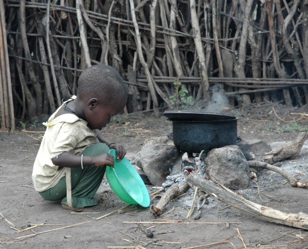 2月3日,在乌干达东北部的莫罗托地区,一名儿童等待煮熟的食物。受东北部地区旱灾影响,目前乌干达国内超过97万人面临着严重饥荒的威胁。当地人道主义机构说,灾民们已经开始食用野果、树叶以求生存。联合国世界粮食计划署和乌干达政府已共同启动一项总值6400万美元的紧急援助计划,帮助灾民渡过难关。 (新华社发)