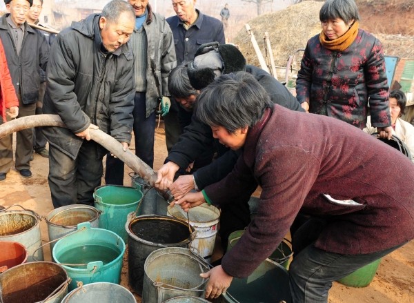 2月4日,汝阳县城关镇张河村的村民们在领取送水车运来的饮用水。自2008年10月以来,位于豫西山区的河南省汝阳县持续干旱达126天,累计降雨量不足10毫米。严重的旱情造成30万亩小麦遭受了不同程度的灾害,全县14个山区乡镇的1.1万人饮水严重困难。目前,全县正动员社会各界力量,全力抗旱浇麦,同时组织车辆向人畜缺水地区送水,确保人畜饮水安全。
