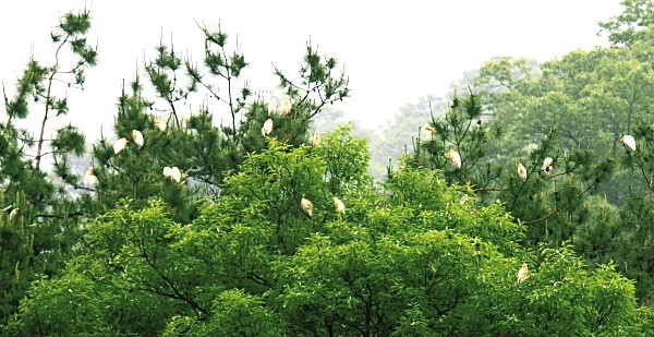 随着景区生态环境日益改善,越来越多的珍稀鸟类前来“安家落户”,图为数百只黄头鹭栖息在大洪山风景区洪山禅寺附近丛林中。